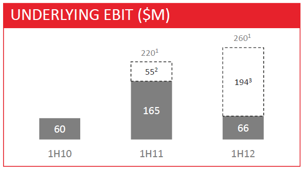 The notes from Qantas noted that the Industrial dispute last year cost the airline $194m.  In the corresponding 1H11, the mess with Boeing and the A380 Grounding cost the airline $55m.  On top of this, the fuel bill went up $444m across the whole group for the period.  I can not help but think that if Alan Joyce had not grounded the Qantas fleet last year, the EBIT for the Qantas segment would be closer to $200m and Group EBIT in the region of $420m.  Now I am not privy to how Qantas keep their books and how the accountants came around the loses for the grounding but I can not help but think that it just does not add up and the PR team are being liberal with the facts.
