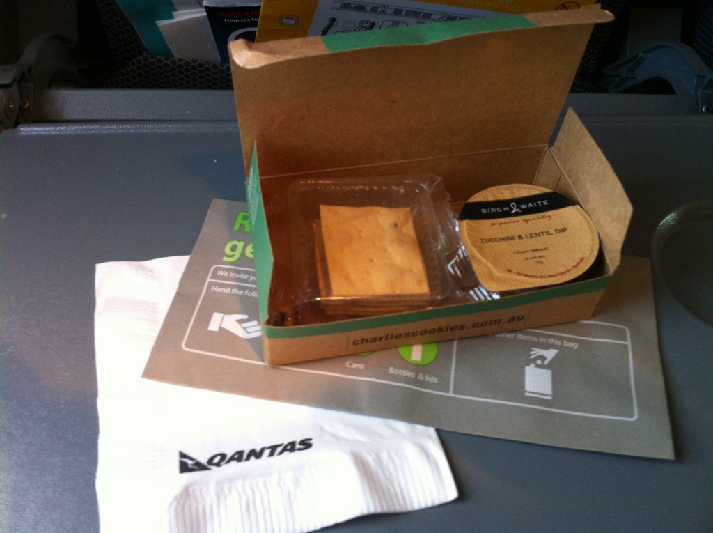 Qantas also seem to have adopted new suppliers for the boxed food.  We got, what only can be described as pressed tomato biscuits with a yogurt dipping sauce.  In the good old days (last year) it was inedible Panini’s.  Being a past export of boarding school, I generally do not have food hang up’s as I would have passed away somewhere between my 11th and 12th birthday from malnutrition. But this is getting out of hand.